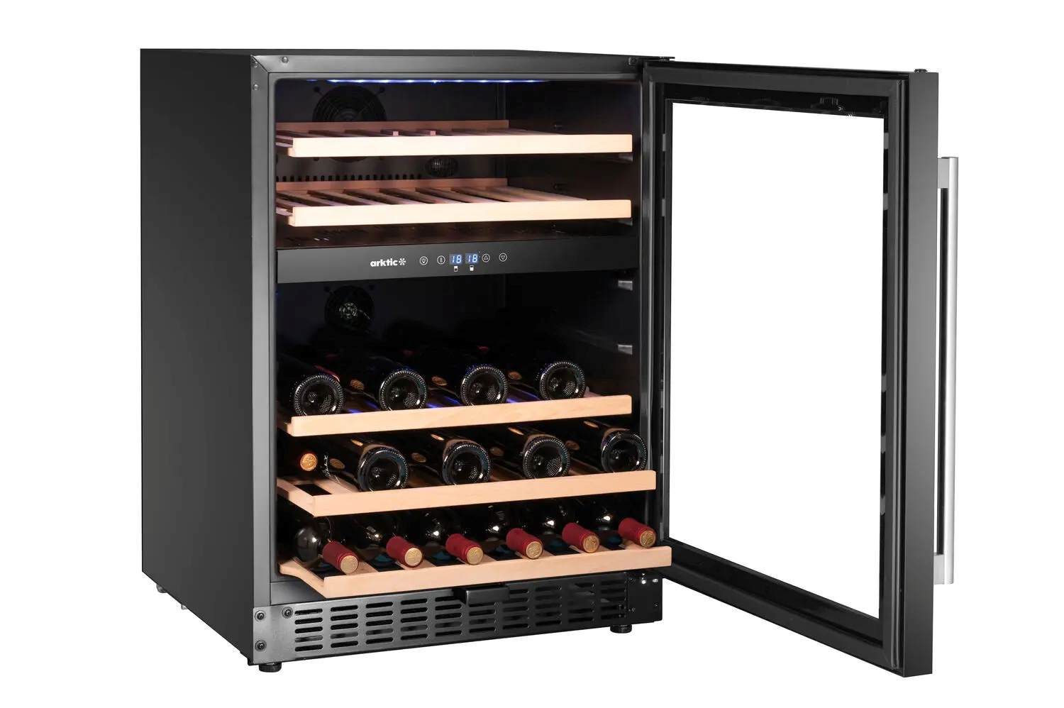 „Arktic“ vyno šaldytuvas, 2 zonų, 46 butelių, turi dvi šaldymo zonas su reguliuojama temperatūra. tinka laikyti iki 46 butelių. Juoda milteliniais dažais dengta apdaila, grūdinto berėmio stiklo durelės, ištraukiamos buko medienos lentynos ir LED apšvietimas, todėl ją galima įmontuoti ir įmontuoti, ir pastatyti atskirai. Skaitmeninis ekranas, jutikliniai valdikliai, automatinis atitirpinimas ir durelių užraktas papildo funkcionalumą.