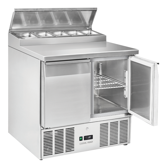 „Cool Head CRS 90A“ – tai profesionali dviejų durų šaldomoji saladetė, specialiai sukurta sumuštinių barams, kavinėms ir greito maisto užkandinėms. Šis modelis sujungia patvarų nerūdijančio plieno stalviršį su integruota ingredientų zona, todėl tai yra idealus sprendimas greitam produktų surinkimui vienoje vietoje.