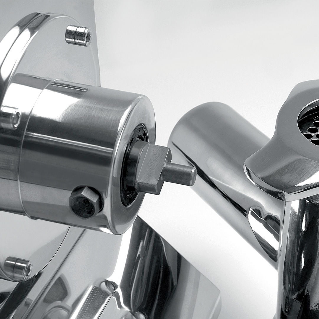 Lengvai nuimamas mėsmalės blokas, pagamintas iš: beelektrodinio nikelio dengto ketaus / anoduoto aliuminio / AISI 304 nerūdijančio plieno