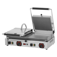 Profesionali stalviršinė elektrinė panini grilinė su kombinuota viršutine plokšte, užtikrinančia vienodą kepimą. Korpusas pagamintas iš nerūdijančio plieno su nusmėliuotu paviršiumi be dangos. Įrenginyje įrengtas riebalų surinkimo indas, indikatoriaus lemputės, vienas valdymas viršutinei ir apatinei kaitinimo plokštei.