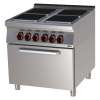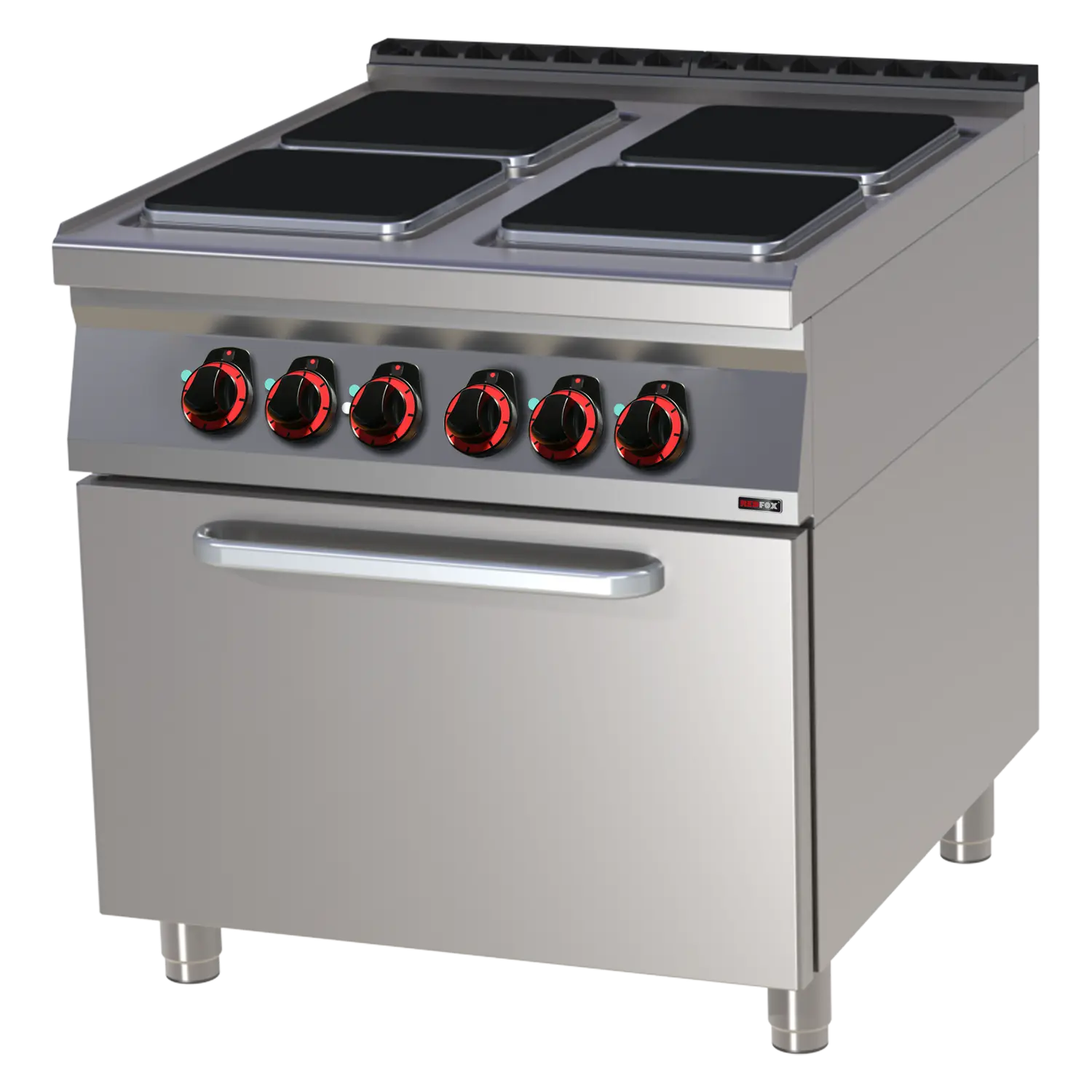 Profesionali elektrinė viryklė su keturiomis kvadratinėmis kaitvietėmis ir integruota elektrine konvekcine orkaite GN 1/1. Puikiai tinka intensyviai naudojamoms virtuvėms.