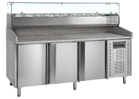 Naujo dizaino picos stalas su granito stalviršiu, ventiliuojamu aušinimu ir automatiniu atitirpimu. Komplektuojamas su VK38-200 priedų vitrina GN1/3 indams. Kiekvienose duryse yra kreipiančiosios 7 picos skardoms (400×600 mm). Konstrukcija iš aukštos kokybės nerūdijančio plieno, savaime užsidarančios durys ir reguliuojamos kojelės užtikrina patogų naudojimą.