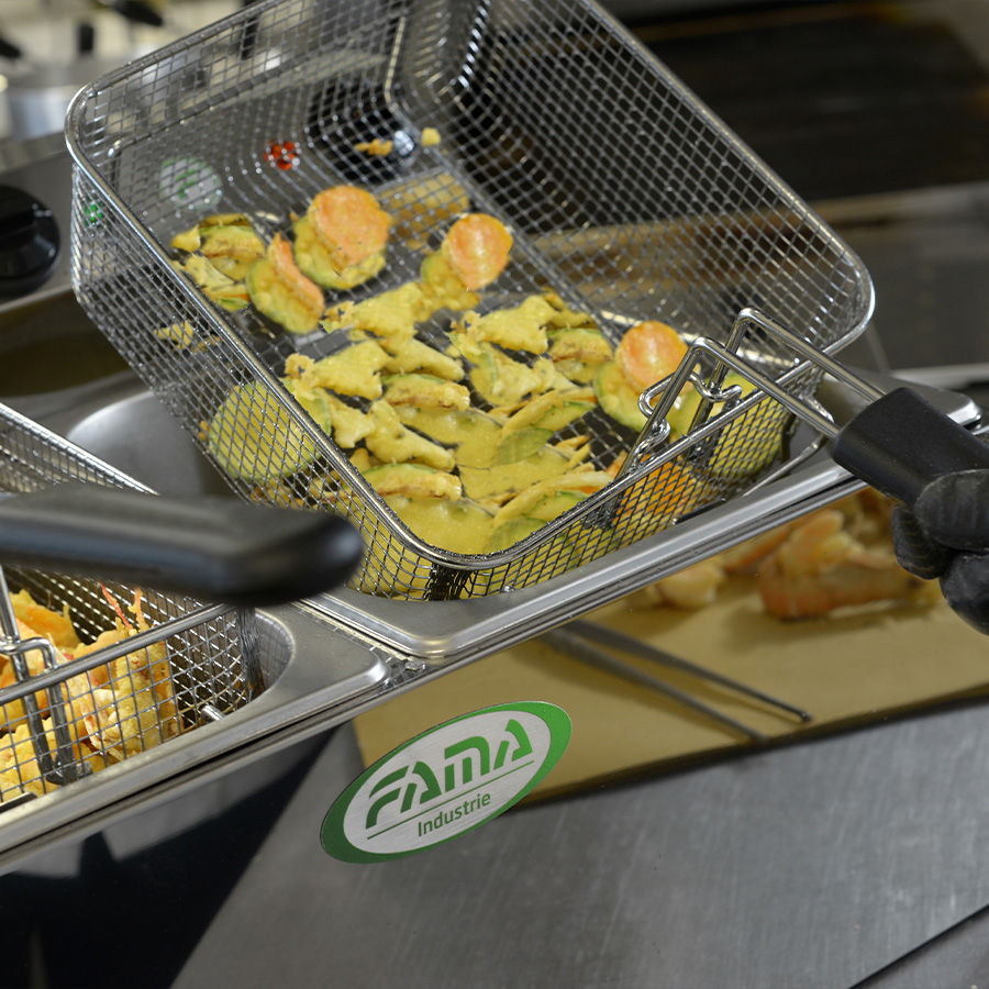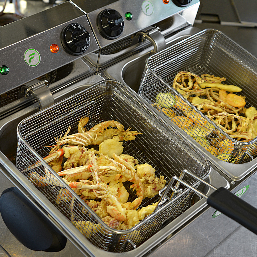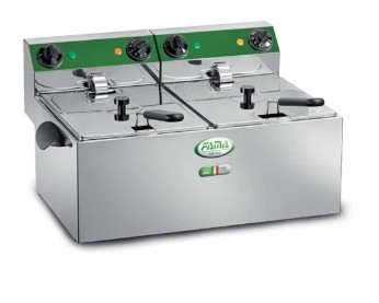 Profesionali stalviršio tipo elektrinė gruzdintuvė su dviem nepriklausomomis talpomis po 6 litrus.