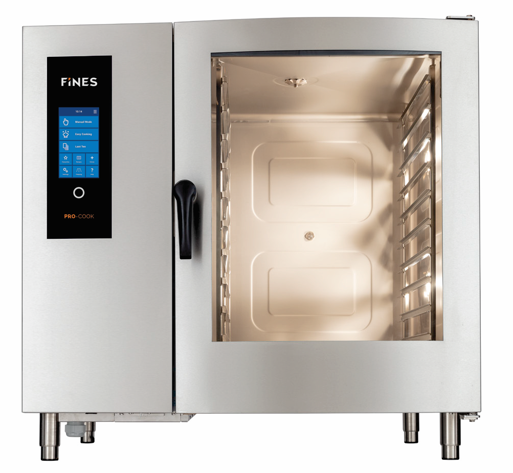 FINES PRO-COOK electric F2-1021 i yra pramoninio lygio kombinuota krosnis, sukurta didžiausioms gamybinėms virtuvėms, didmeninėms maitinimo įstaigoms ir viešbučiams, aptarnaujantiems nuo 300 iki 500 porcijų. Šis flagmano modelis išsiskiria neprilygstama 10 lygių GN 2/1 formatu talpa ir galinga 29,6 kW galia.