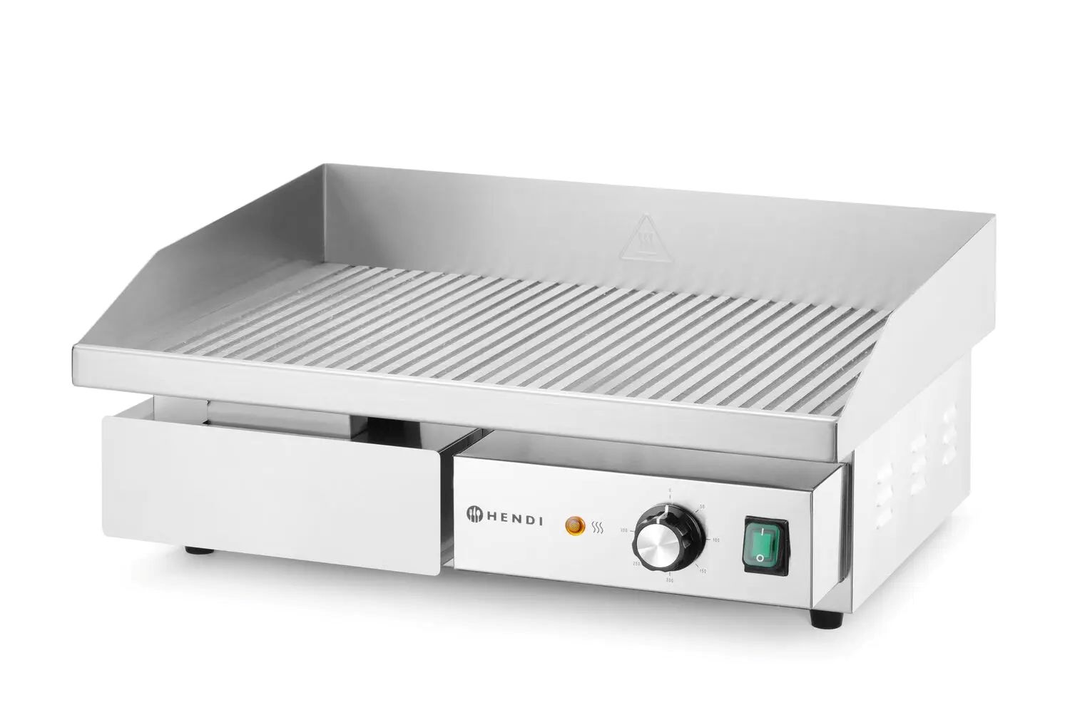 HENDI briaunota grilio plokštė Budget Line išsiskiria grūdinta plieno grilio plokšte, kuri gali pasiekti iki 300°C temperatūrą. Grilis puikiai tinka riebiai mėsai, pavyzdžiui, mėsainiams ir dešroms, ruošti. Galinio bortelio ir nuimamo lašėjimo padėklo derinys užtikrina lengvą valymą ir higieną.
