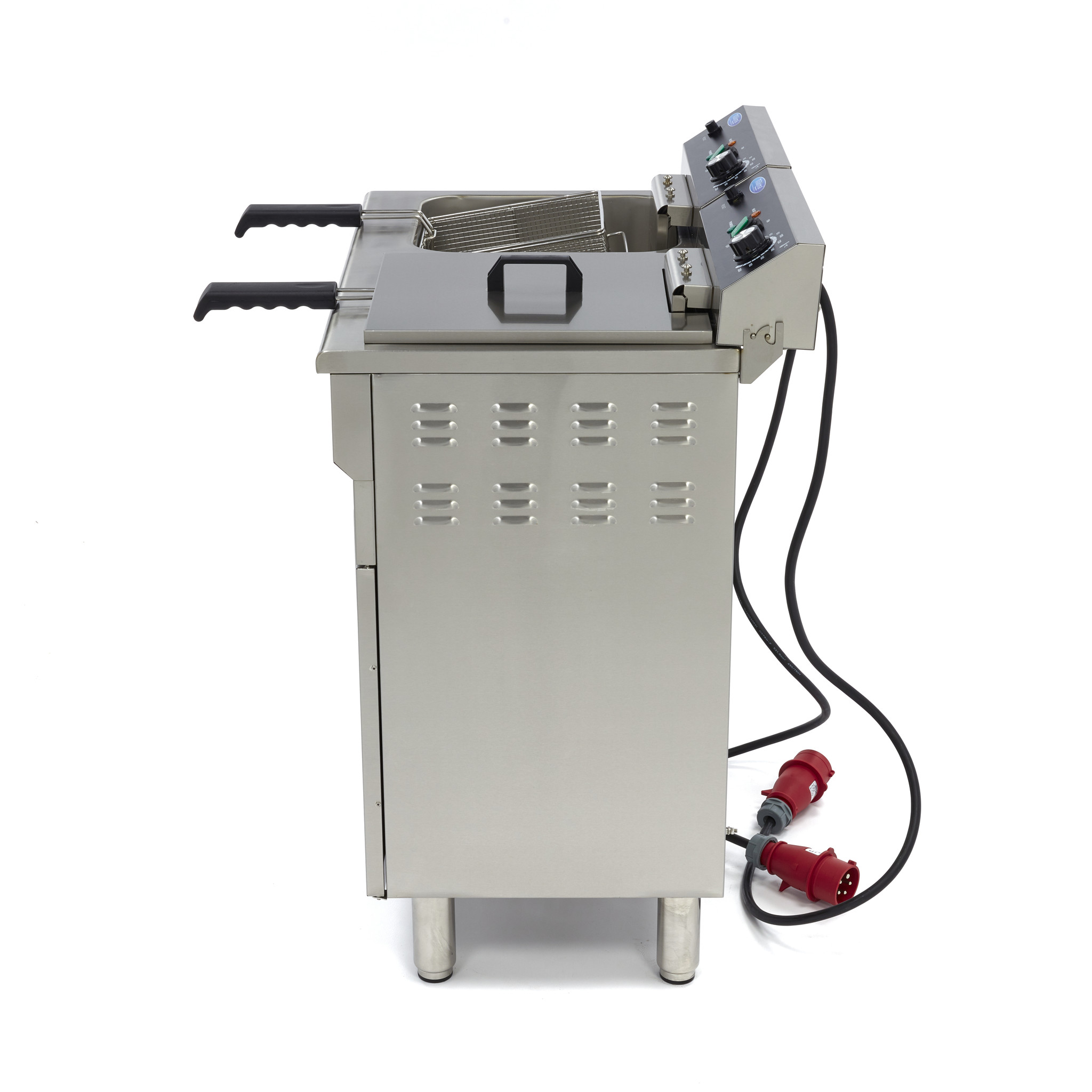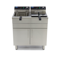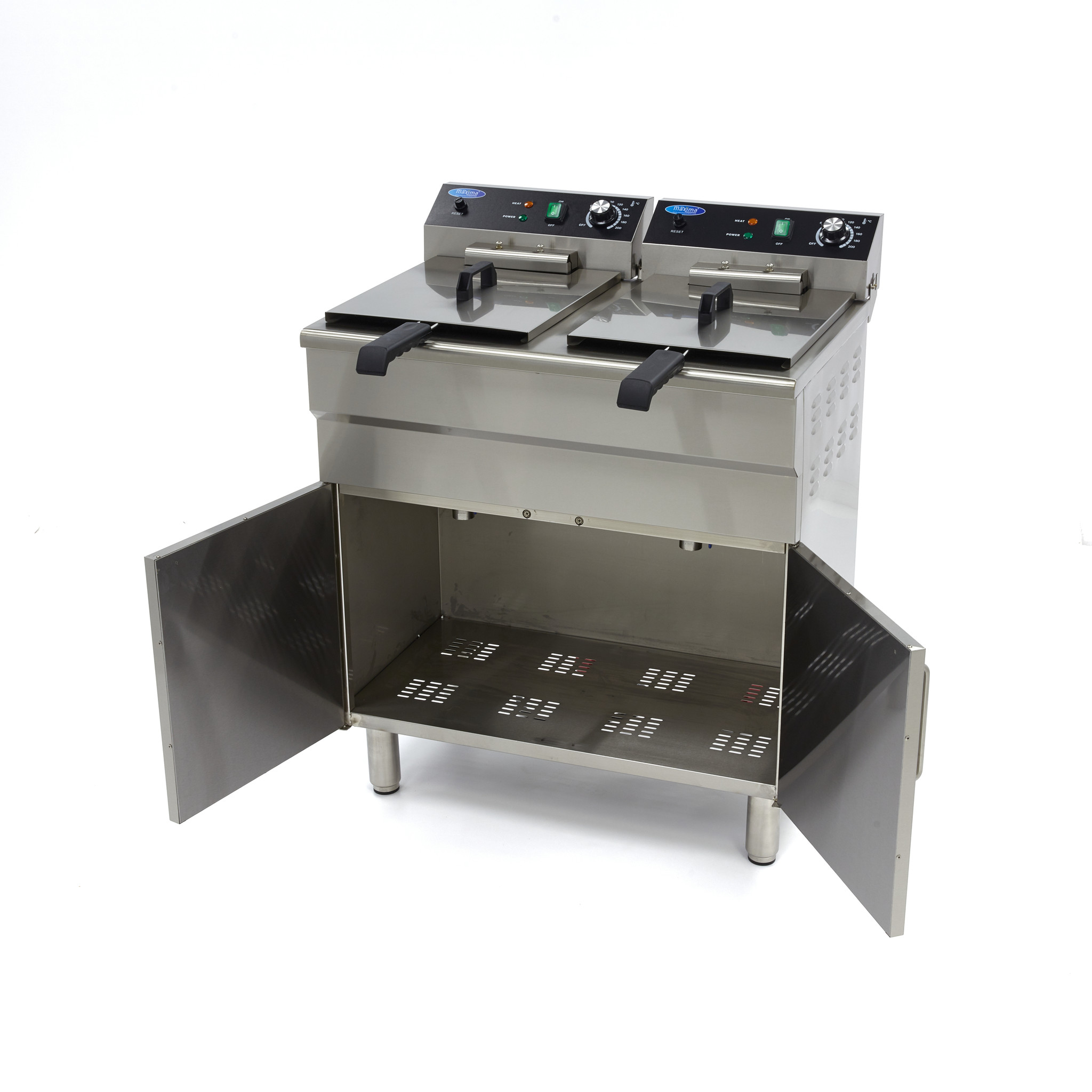 Profesionali dviguba gruzdintuvė su spintele ir dviem išleidimo čiaupais skirta intensyviam naudojimui. Du 16 litrų talpos indai leidžia kepti didelius kiekius bulvyčių, užkandžių, žuvies ar daržovių vienu metu. Įrenginys turi šaltąją zoną, kuri prailgina aliejaus tarnavimo laiką, o reguliuojamas termostatas palaiko tikslią temperatūrą nuo 50 °C iki 200 °C. Nerūdijančio plieno konstrukcija užtikrina ilgaamžiškumą, o spintelė suteikia papildomos vietos aliejaus ar priedų laikymui. Gruzdintuvė komplektuojama su dviem krepšeliais ir dviem dangčiais.