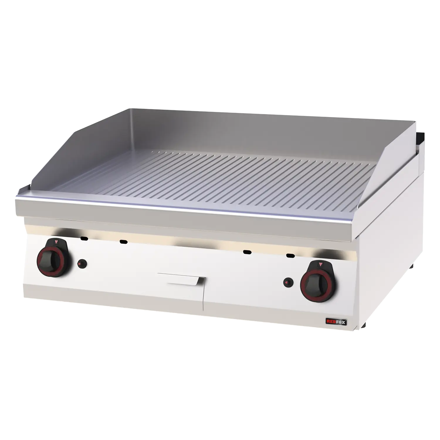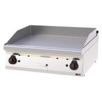 Profesionali stalviršinė dujinė grilio plokštė su rifliuotu chromuotu paviršiumi. Pagaminta iš aukštos kokybės AISI 304 nerūdijančio plieno su AISI 430 apdaila. Turi atskirą kiekvienos kaitinimo zonos valdymą, riebalų surinkimo indą ir nuimamą kraštą.
