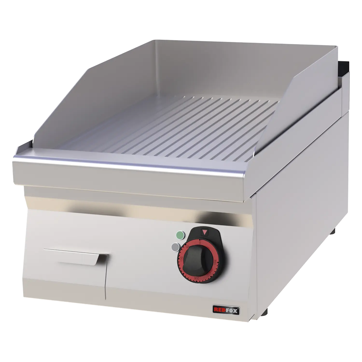 Profesionali stalviršio tipo elektrinė kepimo plokštė su chromuotu grublėtu paviršiumi. Pagaminta iš AISI 304 nerūdijančio plieno su AISI 430 apdaila. Turi riebalų surinkimo talpą, nuimamą kraštą, reguliuojamas kojeles ir saugos termostatą.