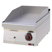 Profesionali stalviršio tipo elektrinė kepimo plokštė su chromuotu lygiu paviršiumi. Pagaminta iš AISI 304 nerūdijančio plieno su AISI 430 apdaila. Turi riebalų surinkimo talpą, nuimamą kraštą, reguliuojamas kojeles bei saugos termostatą.