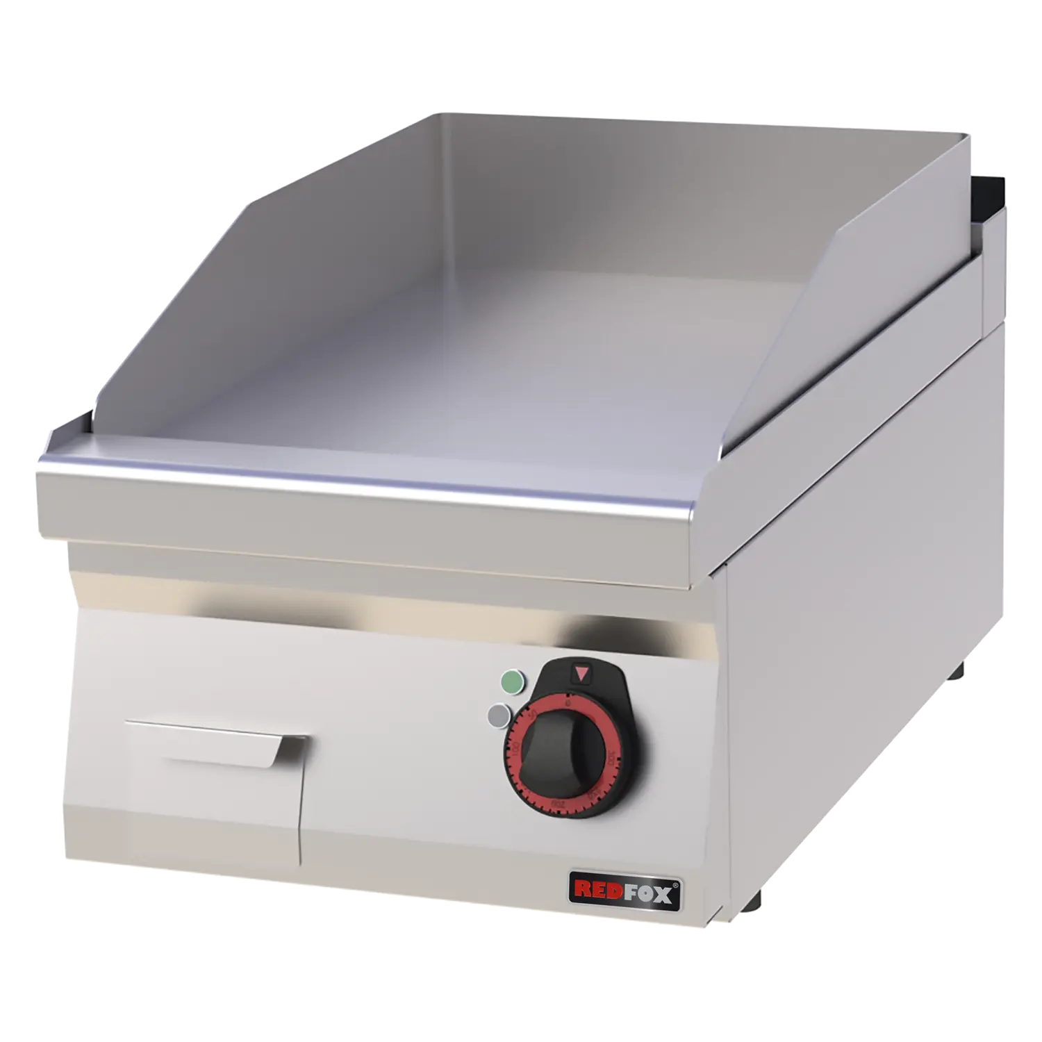 Profesionali stalviršio tipo elektrinė kepimo plokštė su lygiu nusmėliuotu paviršiumi. Pagaminta iš AISI 304 nerūdijančio plieno ir AISI 430 apdailos. Įrenginys turi riebalų surinkimo talpą, nuimamą kraštą ir saugos termostatą.