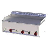 Profesionali stalviršio tipo elektrinė kepimo plokštė su lygiu paviršiumi. Pagaminta iš smėliu sproginto AISI 430 nerūdijančio plieno, leidžia valdyti šildymo zonas atskirai, užtikrina tolygų įkaitimą ir turi riebalų surinkimo talpą.