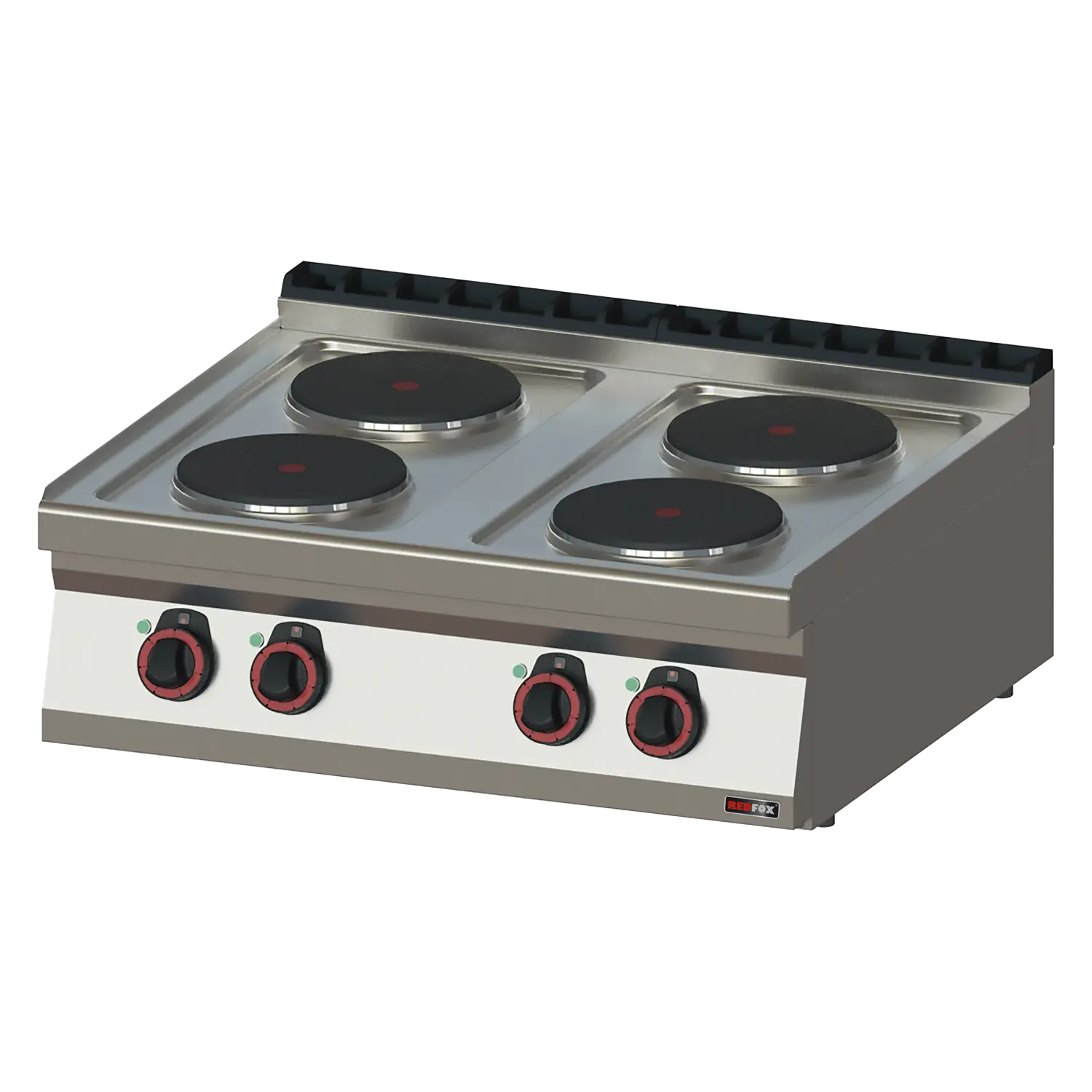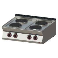 Komercinė elektrinė viryklė su keturiomis galingomis kaitvietėmis, skirta montuoti ant stalviršio arba virtuvės linijos. Nerūdijančio plieno konstrukcija, formuotas viršus ir IPX4 apsauga garantuoja patikimą ir higienišką darbą