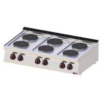 Profesionali komercinė viryklė su šešiomis kaitvietėmis, skirta montuoti ant stalviršio arba virtuvės linijos. Nerūdijančio plieno konstrukcija, formuotas viršus ir IPX4 apsauga užtikrina higienišką bei patikimą darbą virtuvėje