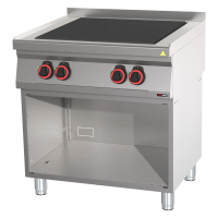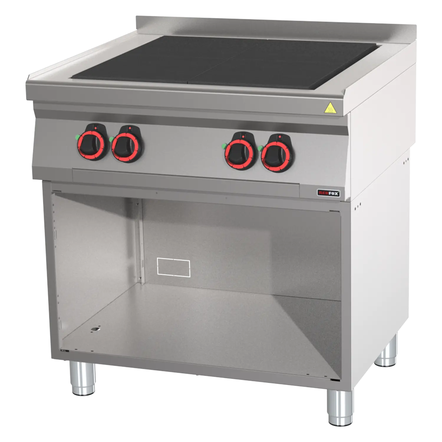 Profesionali elektrinė viryklė su keturiomis vientisomis kaitinimo plokštėmis, sumontuota ant atviros spintelės. Patikima nerūdijančio plieno konstrukcija ir IPX4 apsauga užtikrina našų bei higienišką darbą intensyvioje virtuvės aplinkoje