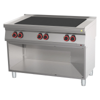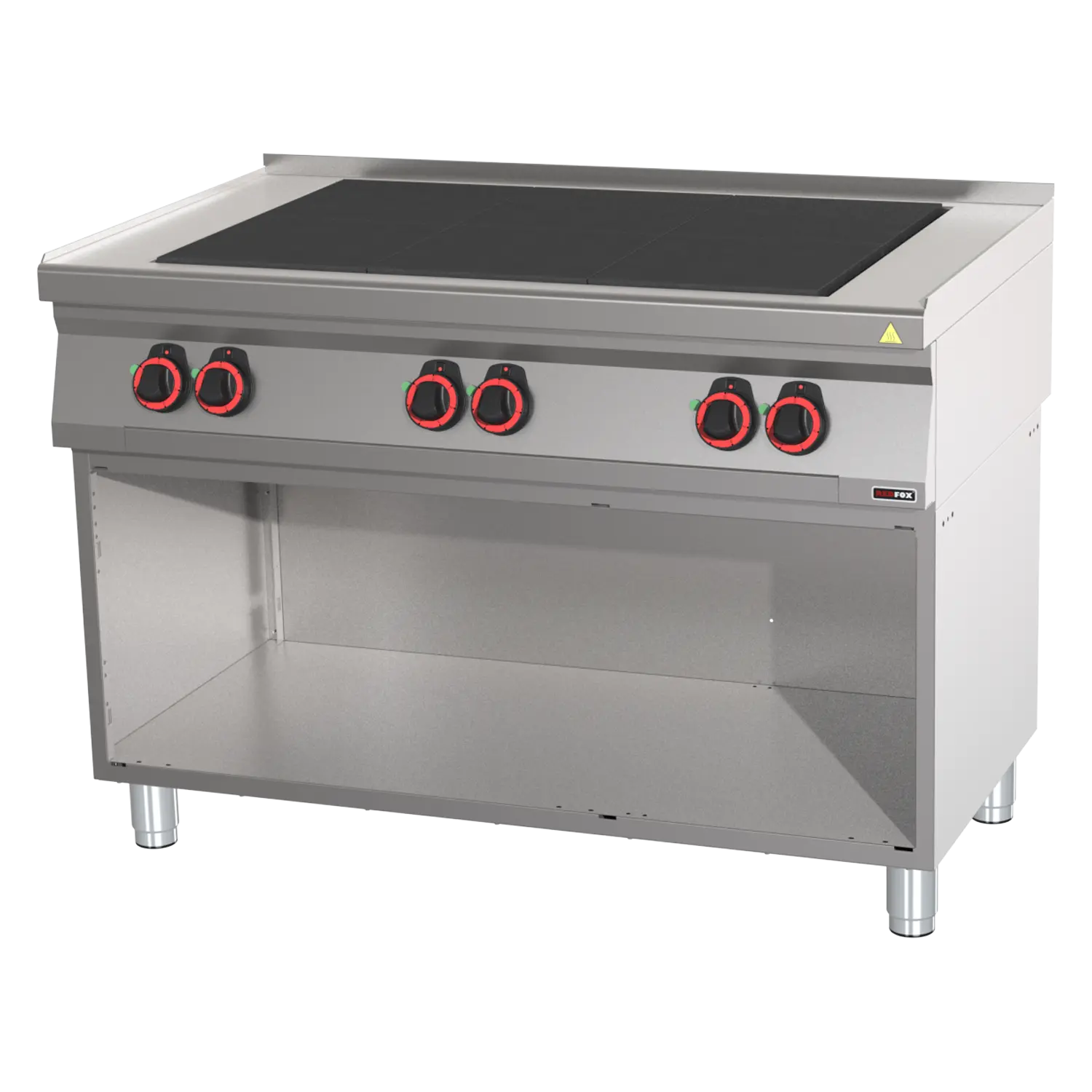 Profesionali elektrinė viryklė su šešiomis vientisomis kaitinimo plokštėmis, įmontuota ant atviros spintelės. Nerūdijančio plieno korpusas, patogus valdymas ir IPX4 apsauga užtikrina efektyvų ir saugų darbą intensyviai naudojamose virtuvėse