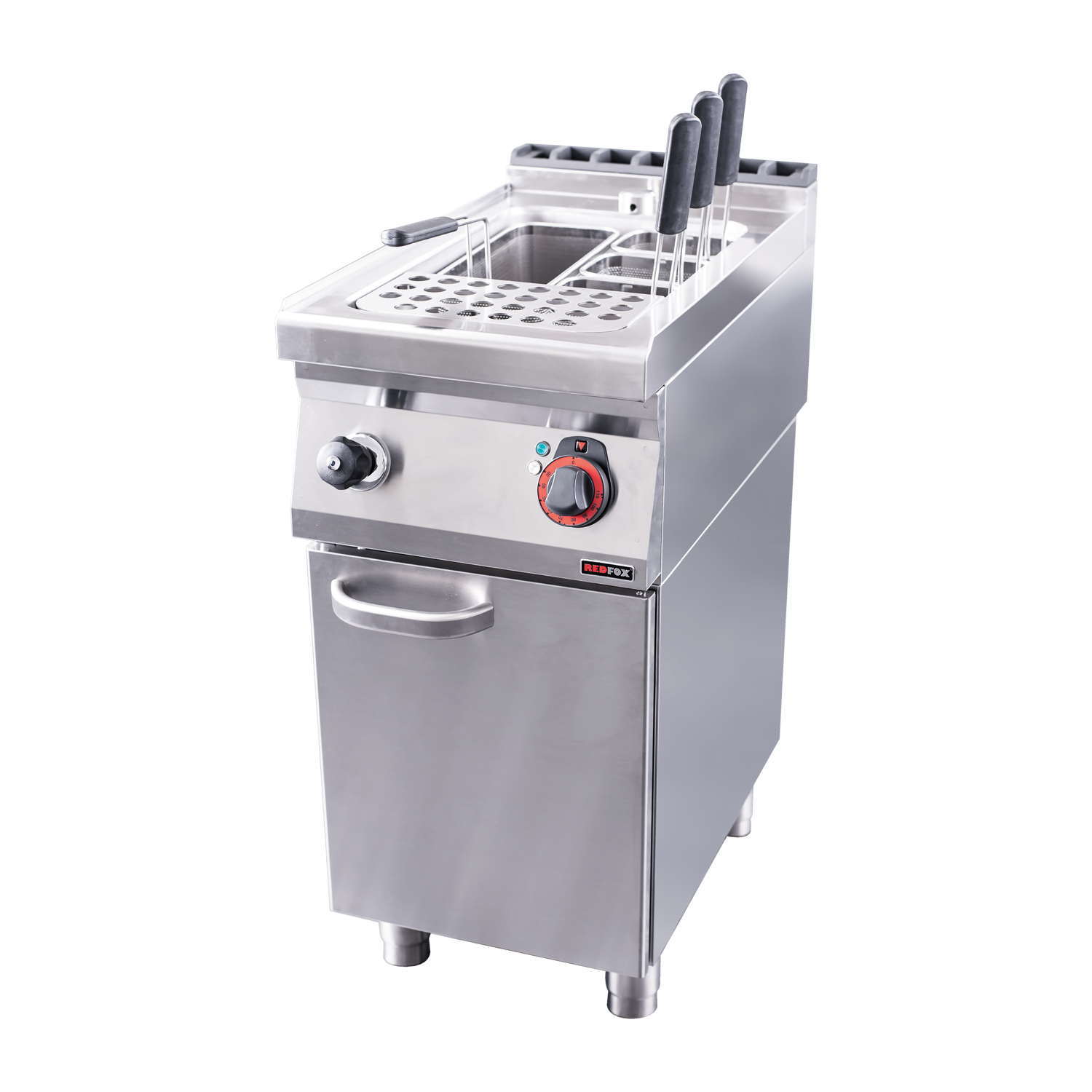 Kompaktiškas ir patikimas REDFOX elektrinis makaronų virimo įrenginys su 23 l talpos vonele. Puikiai tinka profesionaliam naudojimui virtuvėse, kur reikia greitai ir efektyviai paruošti makaronus ar kitus produktus verdančiame vandenyje.