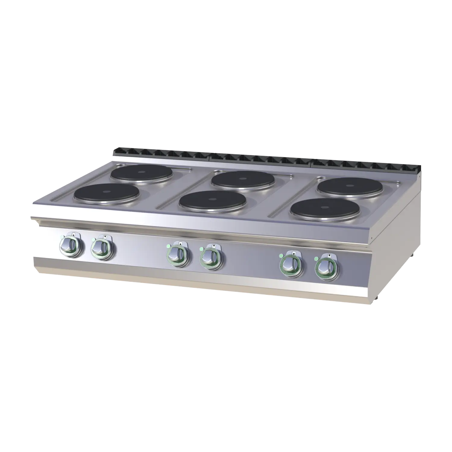 Profesionali stalviršio tipo elektrinė viryklė su šešiomis ovalo formos kaitvietėmis. Pagaminta iš AISI 304 nerūdijančio plieno, skirta intensyviam darbui profesionaliose virtuvėse. Lengvai valoma dėl vientiso paviršiaus ir patogiai aptarnaujama iš priekinės pusės.