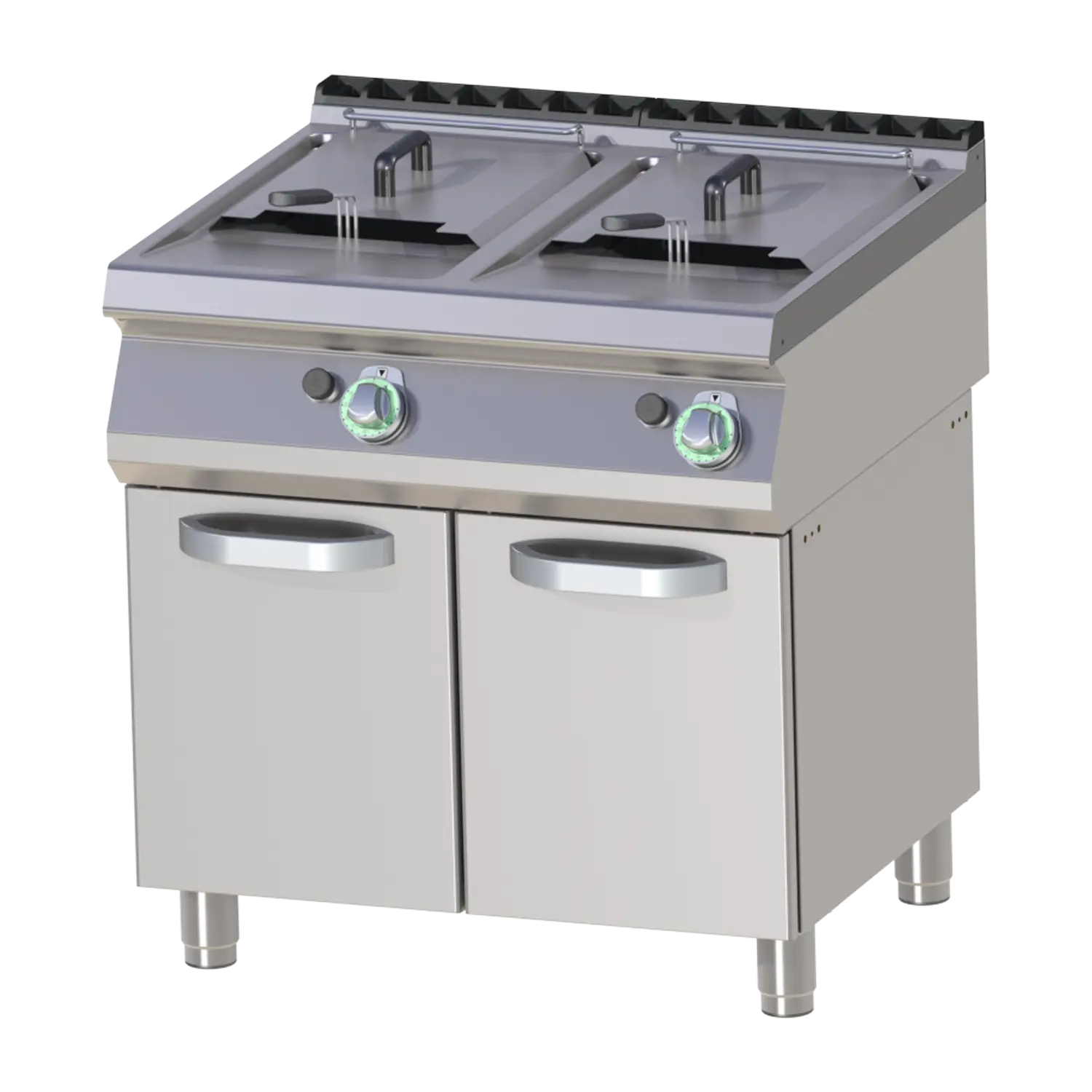 Profesionali dujinė gruzdintuvė su dviem po 17 litrų nerūdijančio plieno bakais, skirta naudoti ant spintelės. Pagaminta iš AISI 304 nerūdijančio plieno su vientisu formuotu stalviršiu, užtikrinančiu lengvą priežiūrą. Tiesioginio šildymo sistema leidžia greitai įkaisti aliejui ir tolygiai paskirstyti šilumą. Komplektuojama su dangčiais ir dviem krepšeliais.