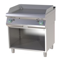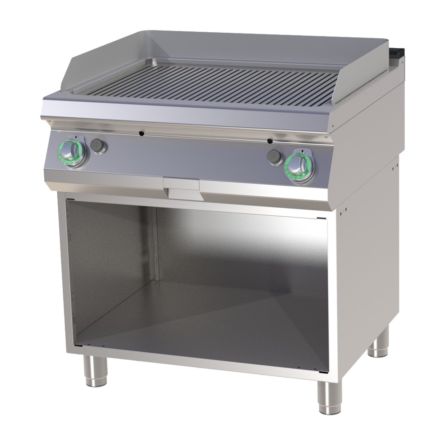 Profesionali stalviršio tipo dujinė kepimo plokštė su grublėtu paviršiumi, montuojama ant atviros spintelės. Pagaminta iš AISI 304 nerūdijančio plieno, leidžia nepriklausomai valdyti šildymo zonas, užtikrina tolygų įkaitimą ir turi riebalų surinkimo talpą.