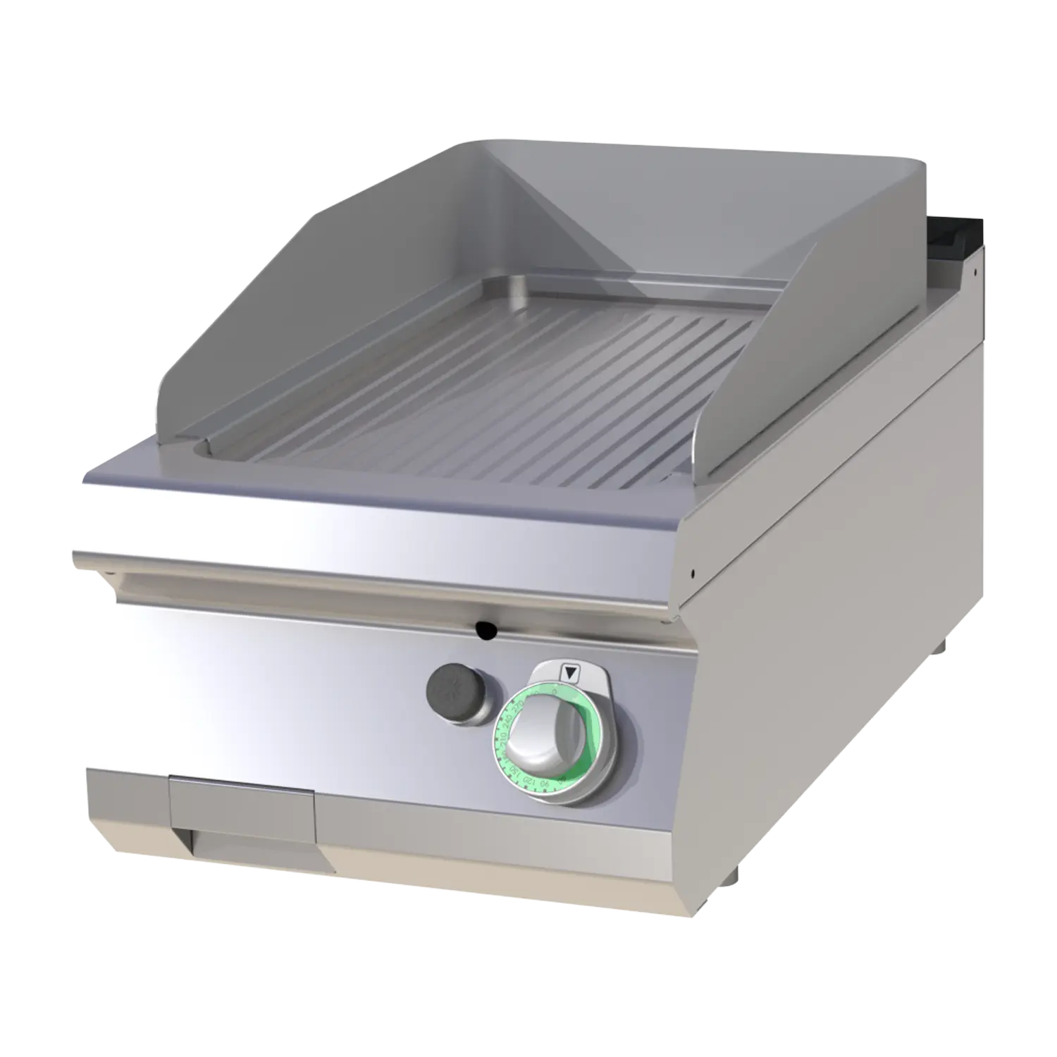 Profesionali stalviršio tipo dujinė kepimo plokštė su grublėtu chromuotu paviršiumi. Pagaminta iš AISI 304 nerūdijančio plieno, užtikrina tolygų įkaitimą ir turi riebalų surinkimo talpą.