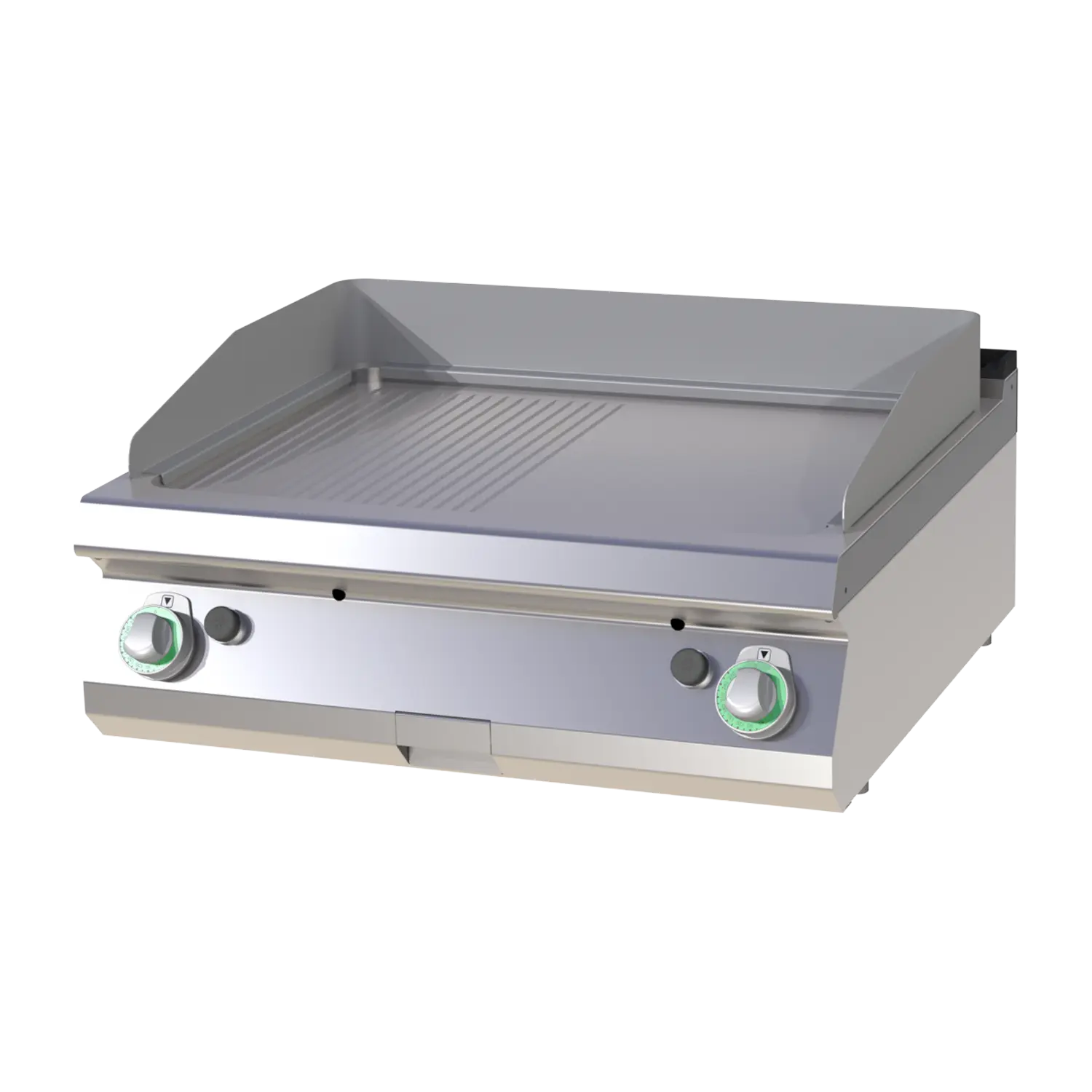 Profesionali stalviršio tipo dujinė kepimo plokštė su kombinuotu paviršiumi. Pagaminta iš AISI 304 nerūdijančio plieno, leidžia nepriklausomai valdyti šildymo zonas, užtikrina tolygų įkaitimą ir turi riebalų surinkimo talpą.