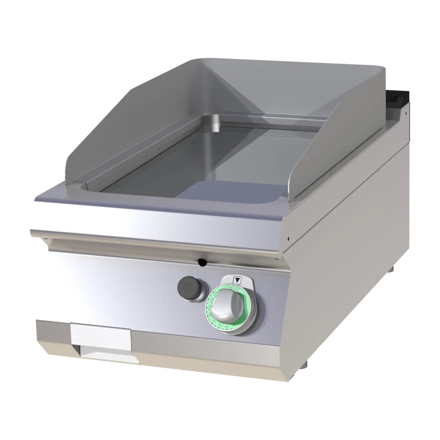 Profesionali stalviršio tipo dujinė kepimo plokštė su lygiu chromuotu paviršiumi. Pagaminta iš AISI 304 nerūdijančio plieno, užtikrina tolygų įkaitimą ir turi riebalų surinkimo talpą.