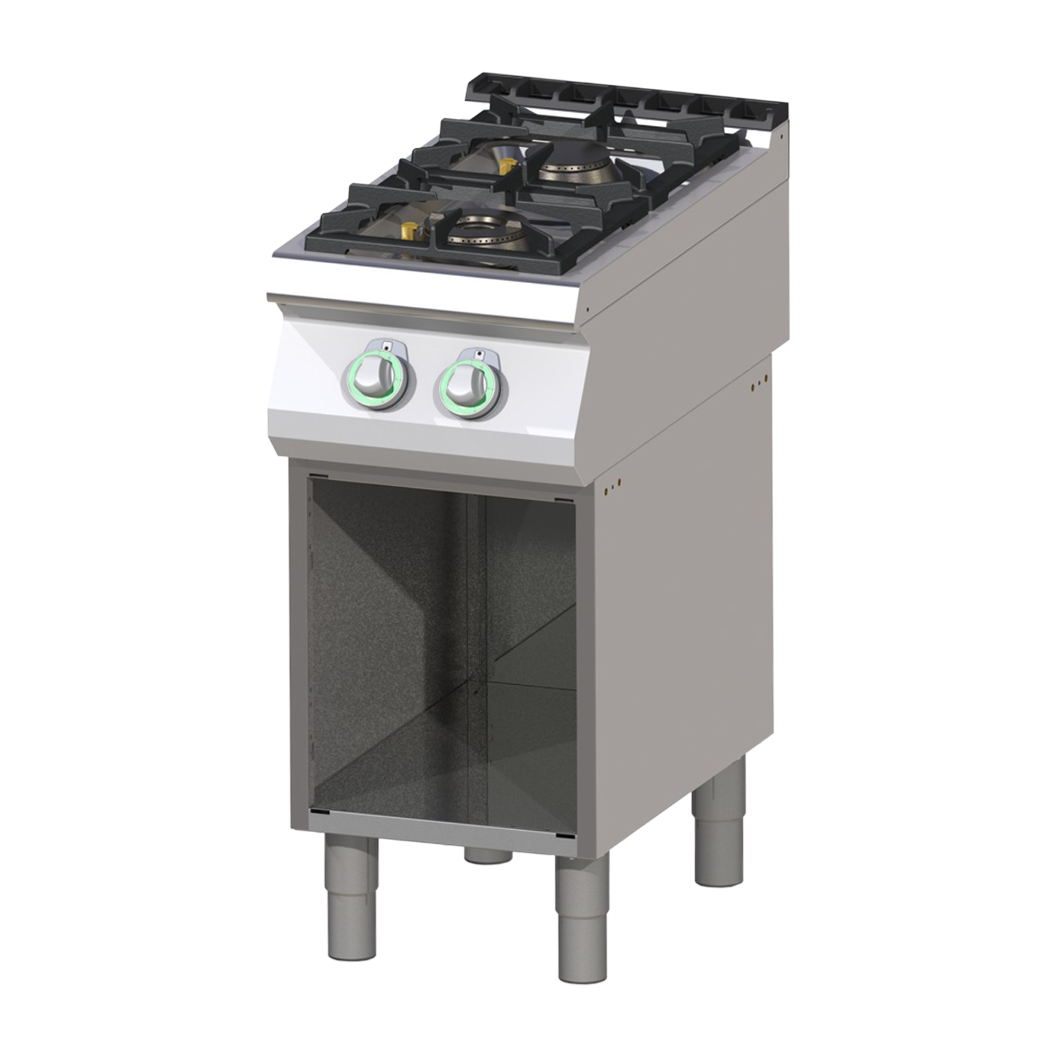 Profesionali grindinė dujinė viryklė su dviem klasikinėmis kaitvietėmis. Pagaminta iš AISI 304 nerūdijančio plieno, turi ketaus grotas ir degiklius, formuotą darbinį paviršių, apsauginį termoelementą ir reguliuojamas kojeles