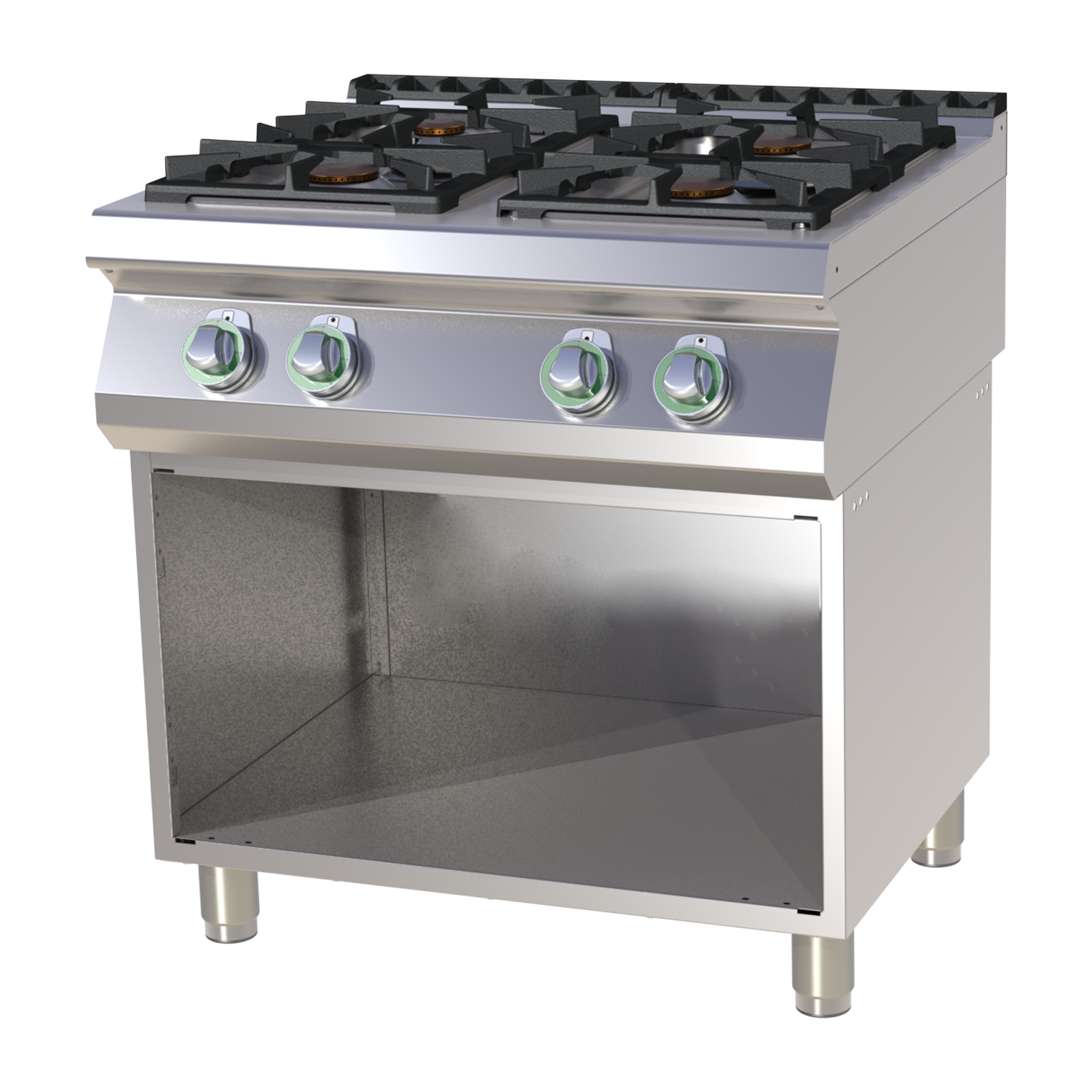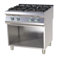 Profesionali grindinė dujinė viryklė su keturiomis klasikinėmis kaitvietėmis. Pagaminta iš AISI 304 nerūdijančio plieno, turi ketaus grotas ir degiklius, formuotą darbinį paviršių, apsauginį termoelementą ir reguliuojamas kojeles