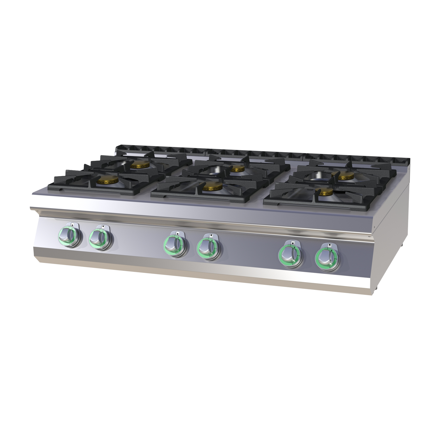 Galinga stalviršio tipo dujinė viryklė su šešiomis padidintos galios degimo zonomis. Pagaminta iš AISI 304 nerūdijančio plieno, turi žalvarinius, išimamus degiklius su vidiniu ir išoriniu degimu, ketaus groteles ir apsauginį termoelementą
