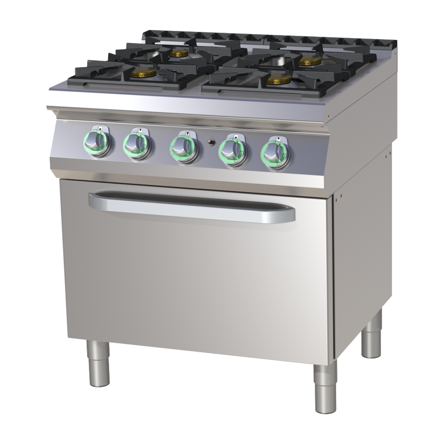 Stacionari dujinė viryklė su keturiomis galingomis degimo zonomis ir GN 2/1 dydžio statine orkaite. Pagaminta iš AISI 304 nerūdijančio plieno, su formuotu stalviršiu lengvai priežiūrai