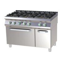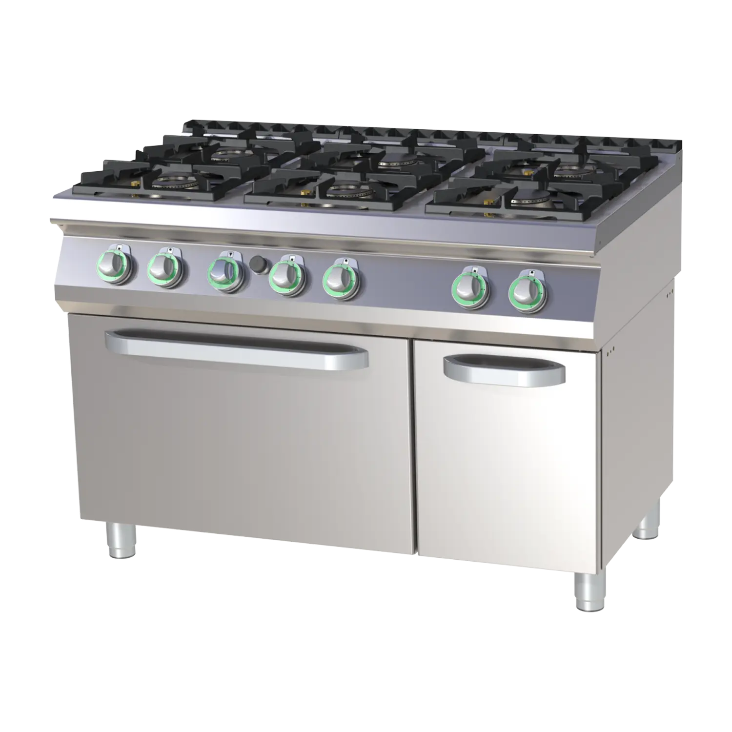 Profesionali stacionari dujinė viryklė su šešiomis ketaus kaitvietėmis ir GN 2/1 statine dujine orkaite. Konstrukcija pagaminta iš AISI 304 nerūdijančio plieno, su formuotu stalviršiu patogiai priežiūrai