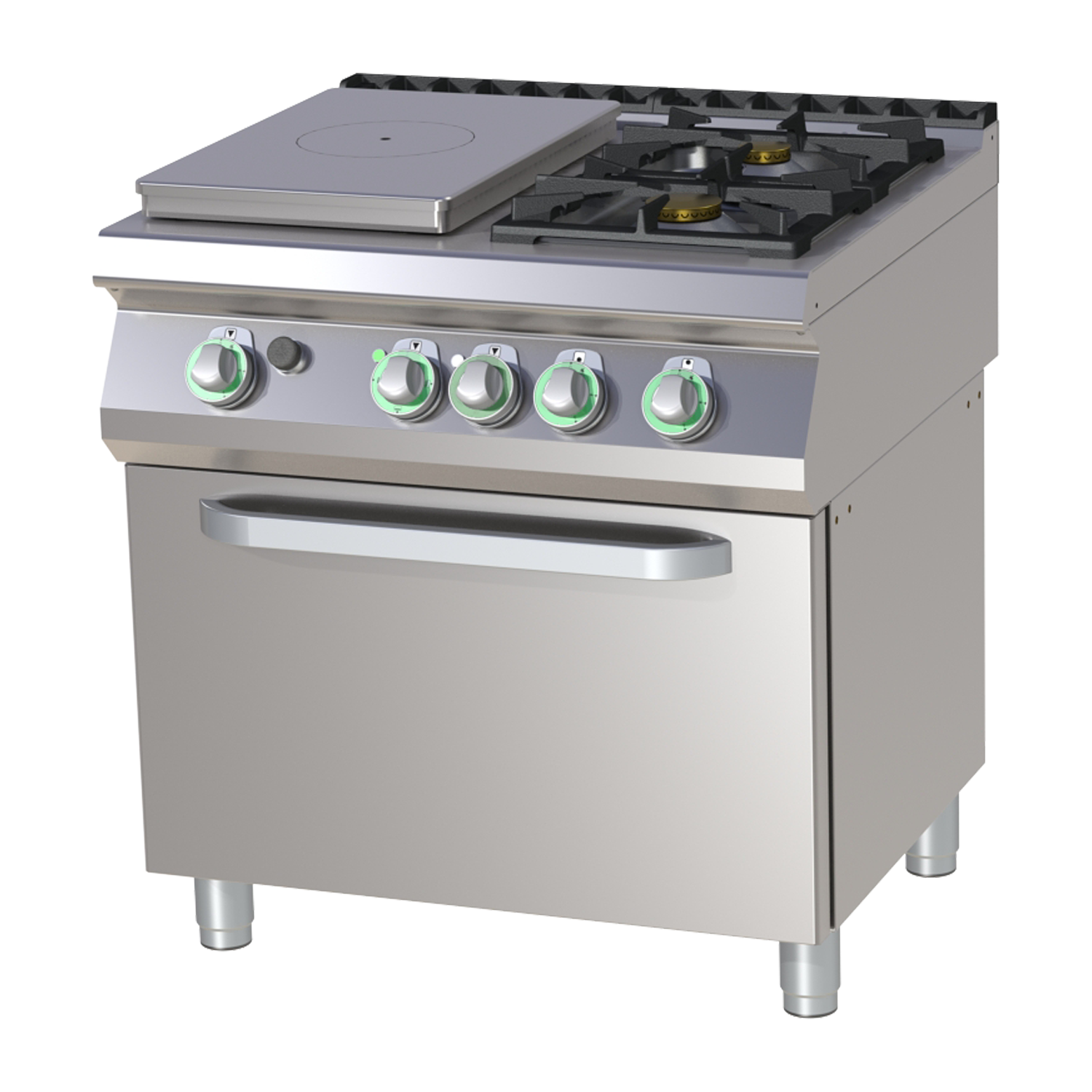 Profesionali stacionari kombinuota viryklė su vientisu kaitinimo paviršiumi ir elektrine statine orkaite. Pagaminta iš AISI 304 nerūdijančio plieno, turi žalvarinius degiklius, priekinį valdymo skydelį, termoporą ir piezo uždegimą.