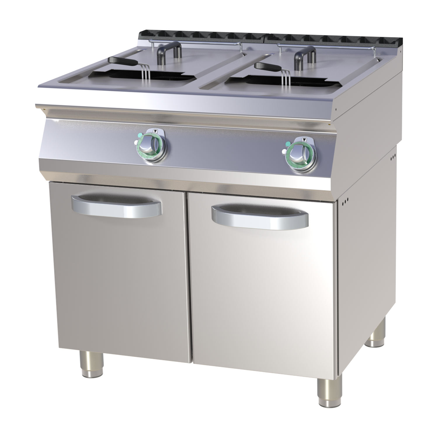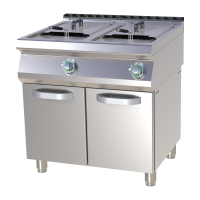 Ypač galinga dviguba elektrinė gruzdintuvė profesionaliam naudojimui su dviem 17 litrų talpos bakais. Įrenginys skirtas naudoti ant spintelės, pagamintas iš AISI 304 nerūdijančio plieno su vientisu formuotu stalviršiu, kuris užtikrina lengvą priežiūrą. Kaitinimo elementai sumontuoti bako viduje, todėl šiluma pasiskirsto tolygiai ir efektyviai. Komplektuojama su dviem dangčiais ir krepšeliais.