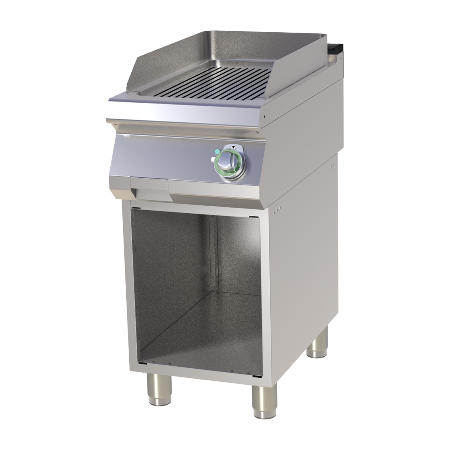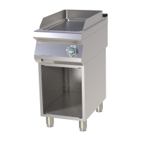 Profesionali elektrinė kepimo plokštuma su gofruotu chromuotu kepimo paviršiumi, montuojamas ant atviros spintelės. Pagamintas iš AISI 304 nerūdijančio plieno, užtikrina tolygų įkaitimą, turi saugos termostatą ir lengvai valomą konstrukciją.