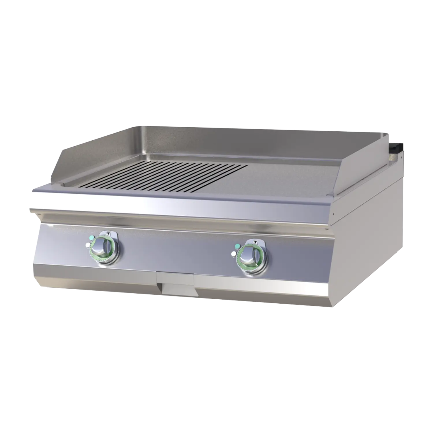 Profesionali stalinė elektrinė kepimo plokštuma su lygiu ir gofruotu kepimo paviršiumi, skirtas intensyviam naudojimui virtuvėje. Pagamintas iš AISI 304 nerūdijančio plieno, su atskiromis šildymo zonų valdymo rankenėlėmis ir priekyje integruotu riebalų surinkimo rezervuaru