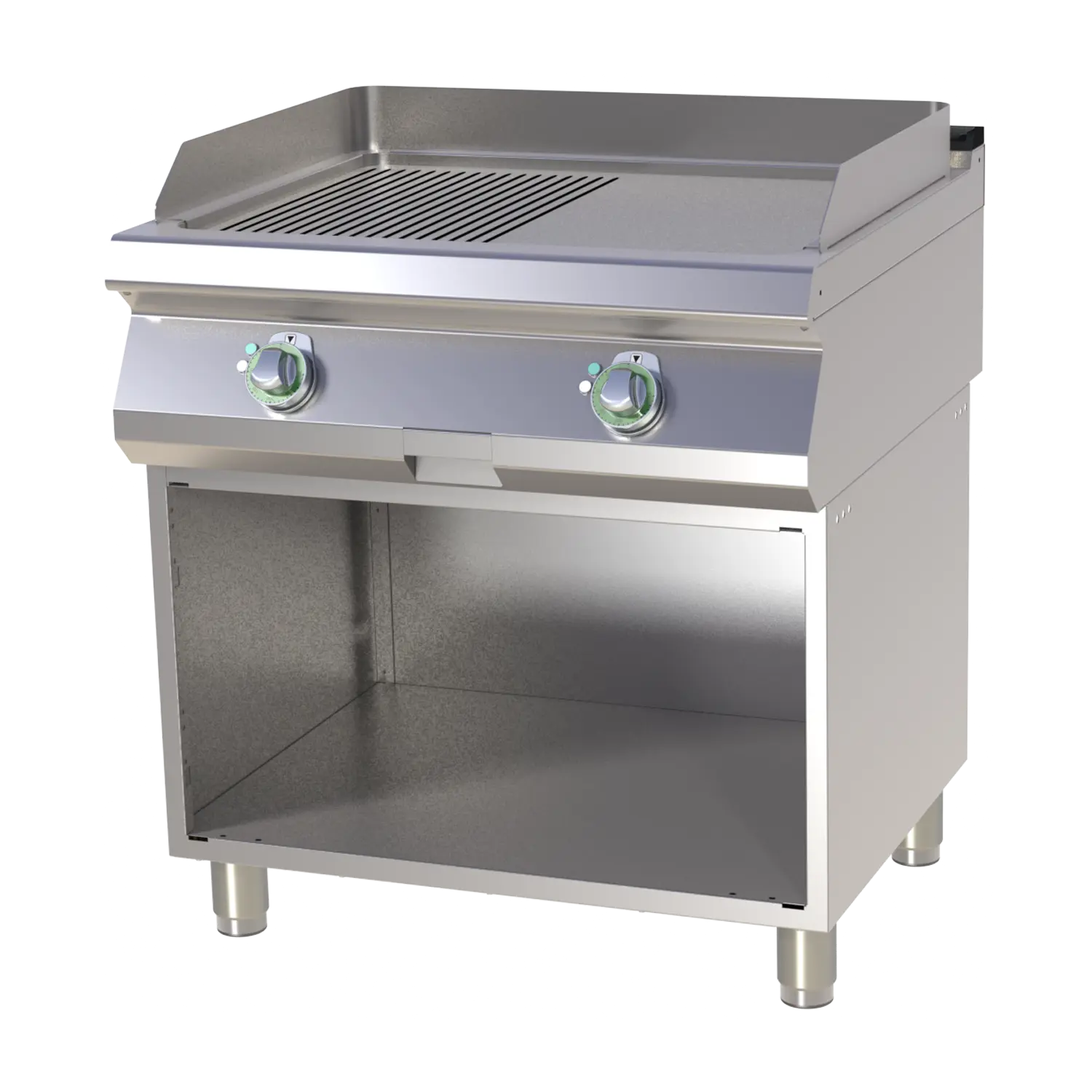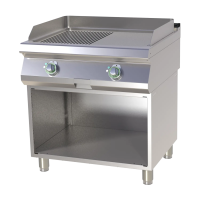 Profesionalus elektrinė kepimo plokštuma su lygiu ir gofruotu paviršiumi, sumontuotas ant atviros nerūdijančio plieno spintelės. Patogus naudoti intensyvioje virtuvės aplinkoje, su atskiromis šildymo zonų valdymo rankenėlėmis ir įmontuota riebalų surinkimo sistema