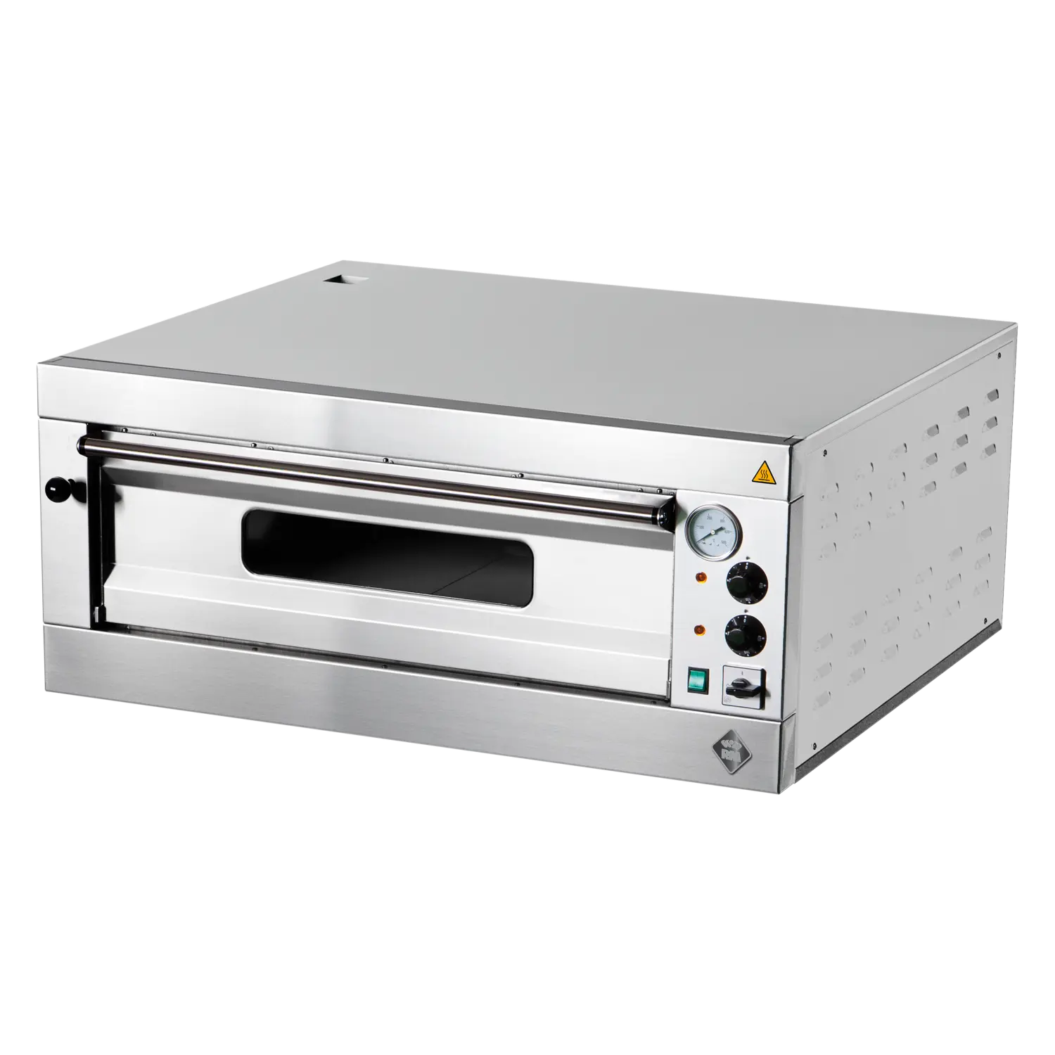 Profesionali elektrinė picos krosnis su viena kamera ir talpa šešioms 33 cm skersmens picoms. Pagaminta iš nerūdijančio plieno.