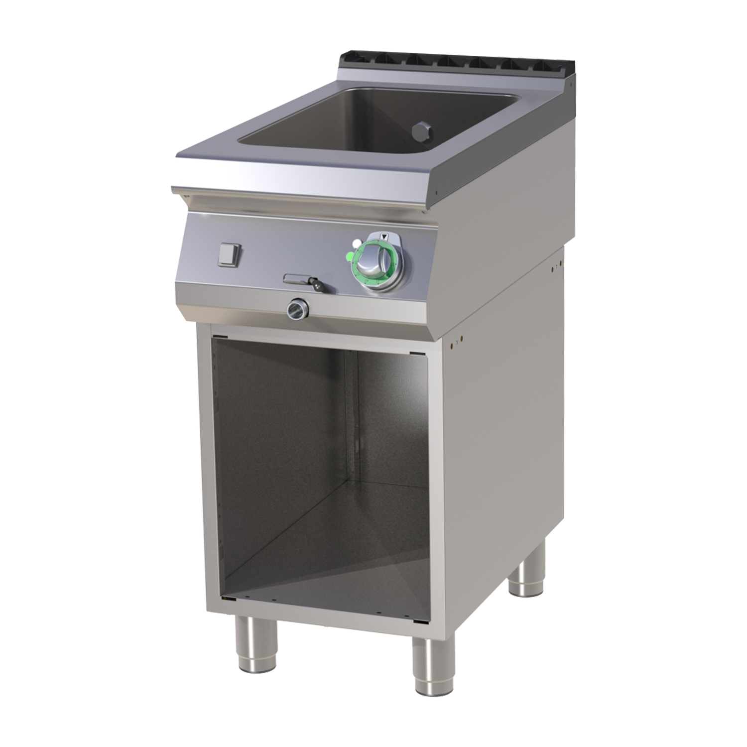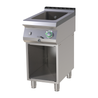 Elektrinis marmitas su spintele, skirtas profesionaliam naudojimui maisto šildymui ir temperatūros palaikymui. Pagamintas iš AISI 304 nerūdijančio plieno su vientisu stalviršiu, kuris palengvina valymą. Įrenginys turi automatinį vandens įleidimą, apsauginį išleidimą, reguliuojamas kojeles. Idealiai tinka gastronominėms GN 1/1 talpoms.