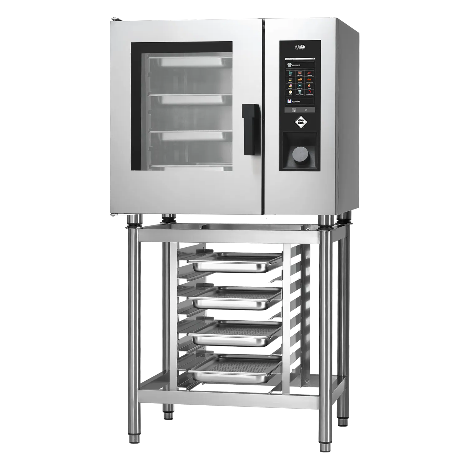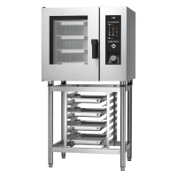 Profesionali kombinuota garinė krosnis su garo katilu ir injekcijos sistema, pagaminta iš AISI 304 nerūdijančio plieno. Valdymas jutikliniu ekranu, reguliuojamos kojelės, drėgmės reguliavimas MeteoSystem technologija. Durys kairėje (vyriukai kairėje, rankena dešinėje).